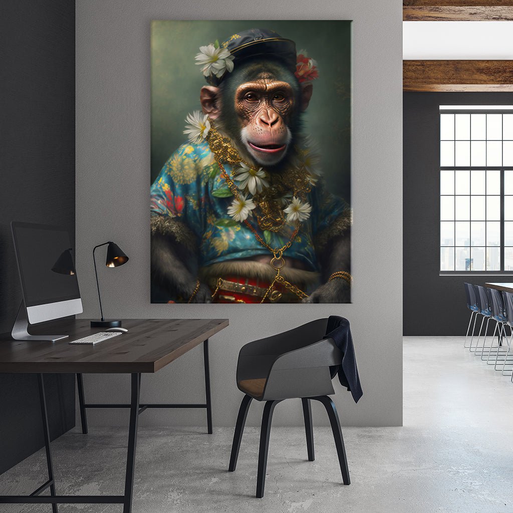 This monkey is dressed like a wealthy tourist, wearing a casual Hawaiian shirt with colorful flowers. His arm and neck are adorned with sparkling gold jewelry and he also wears white flowers as accessories.