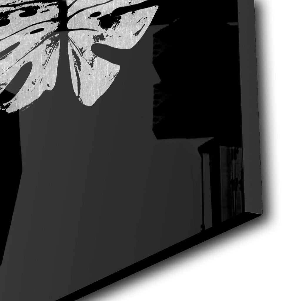 The shiny silver monstera leaf stands on a black background, which creates an impressive contrast. The leaf was designed with great care and attention to detail and gives the artwork a special depth and beauty.