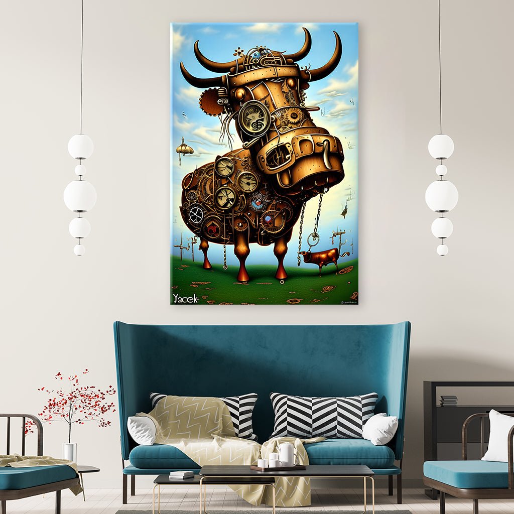 An abstractly designed cow comes to life, consisting of metallic elements and playful electronic components. This modern art in an abstract steampunk style combines organic shapes with mechanical grace. The cow becomes the perfect embodiment of a creative fusion of nature and technology. This unique work of art becomes an eye-catcher in every room and takes you into a world of imagination and innovation.