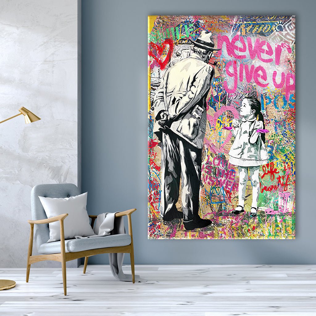 This motif in Banksy's well-known stencil technique on a colorful graffiti wall encourages young and old to never give up.