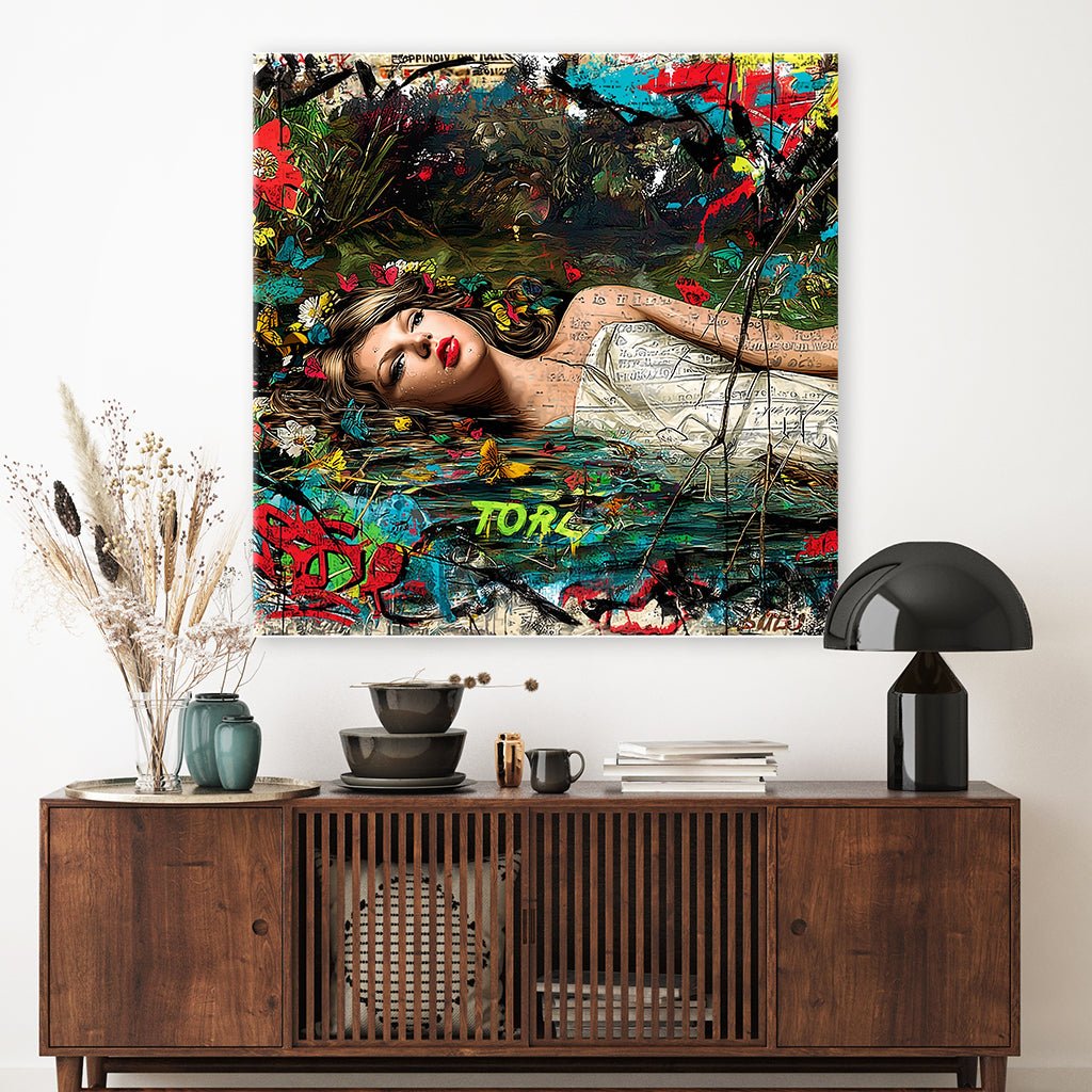 This modern interpretation of "Ophelia" blends classical melancholy with a dynamic street art aesthetic, combining a photorealistic depiction of singer Taylor Swift as Ophelia with newspaper print overlays and vibrant graffiti tags. Set against a chaotic backdrop of neon paint splashes and abstract nature, the result is a powerful mixed-media work.