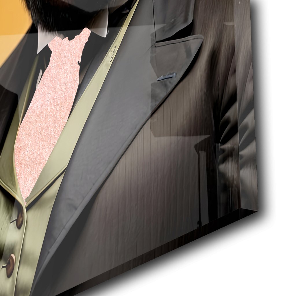 A gorilla in a tailored, elegant suit and matching hat, dressed like an elegant gentleman. His tie and the fabric band around his hat are decorated with rosé gold and, with the subtle yellowish background, form a harmonious and noble image full of elegance, grace and strength.