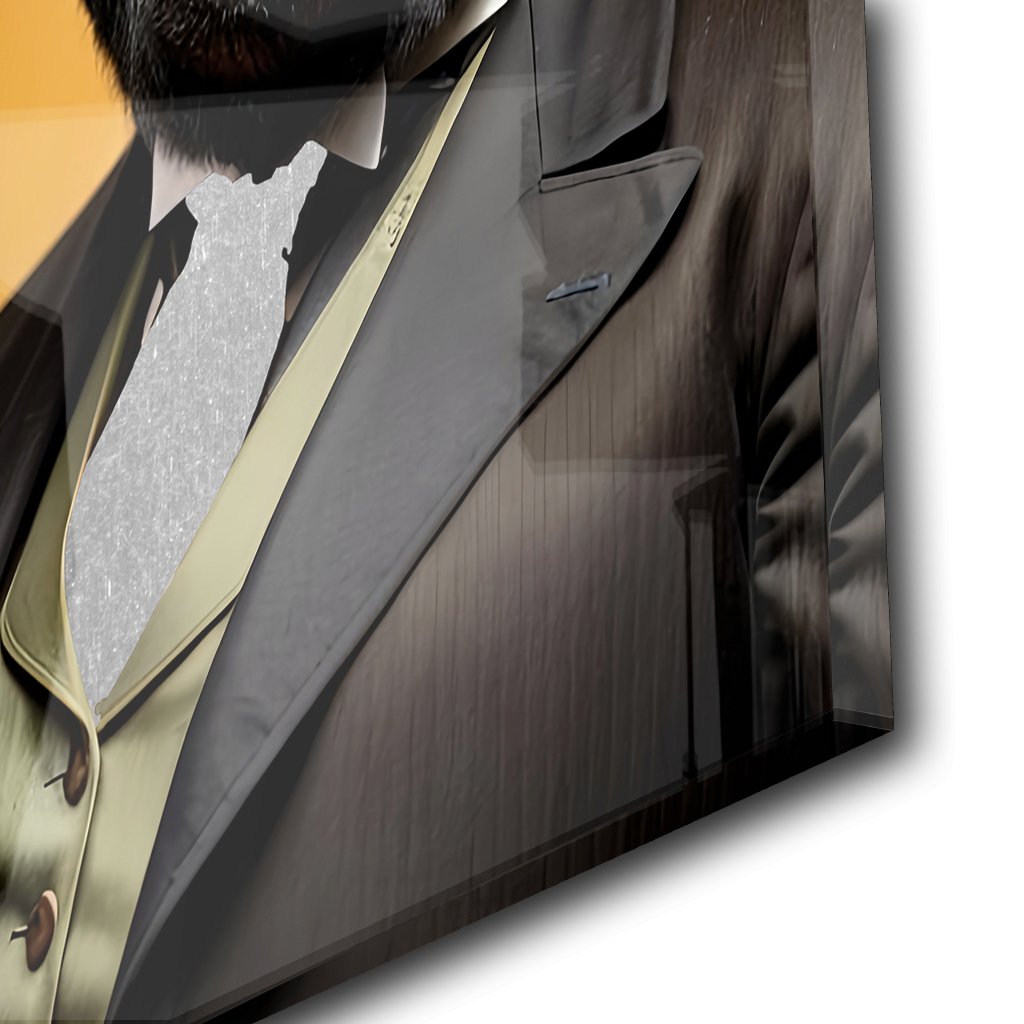 A gorilla in a tailor-made noble suit and matching hat, dressed like an elegant gentleman. His tie and the fabric band around his hat have been decorated with silver leaf and, together with the subtle yellowish background, form a harmonious and noble image full of elegance, grace and strength.