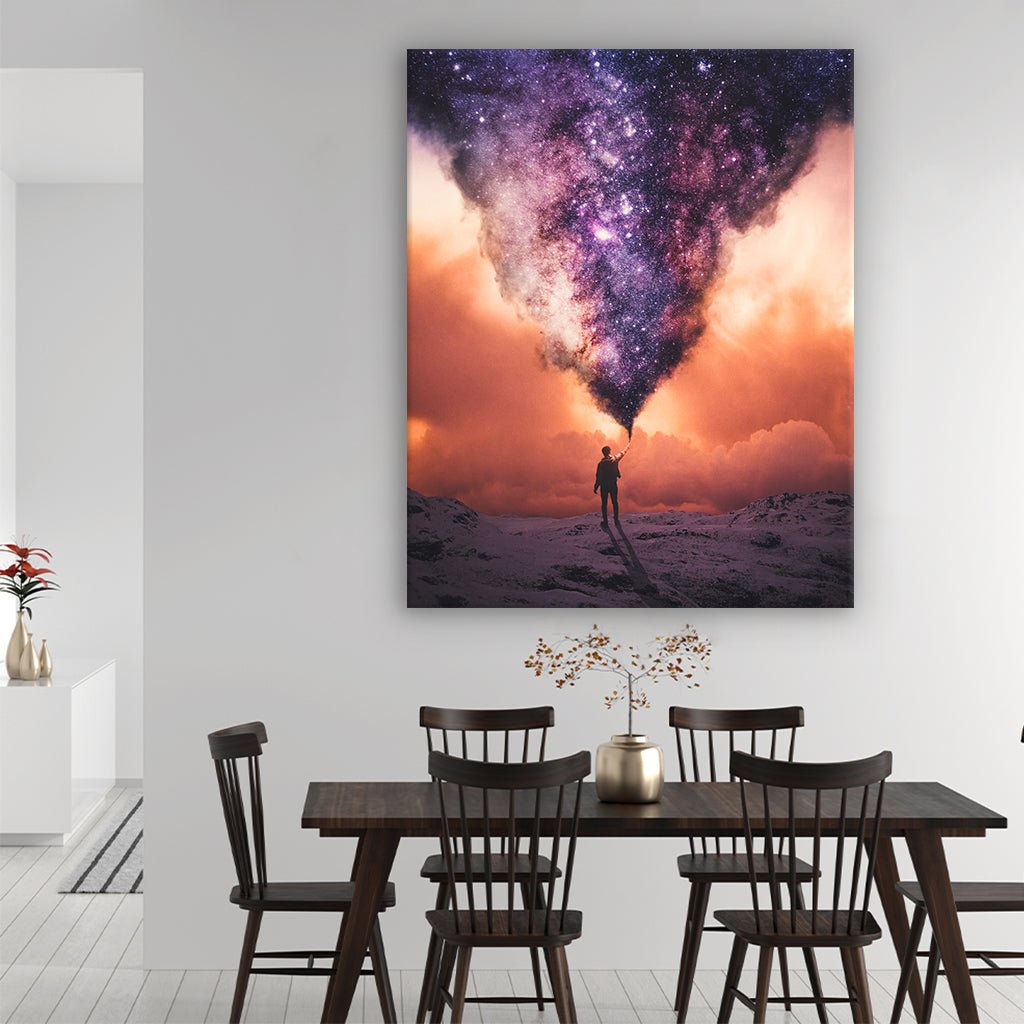 This surrealistic motif shows a man in a snow-covered landscape surrounded by clouds. Above him a rising cloud of smoke in which the constellation from space can be seen. A breathtaking eye-catcher for your walls.