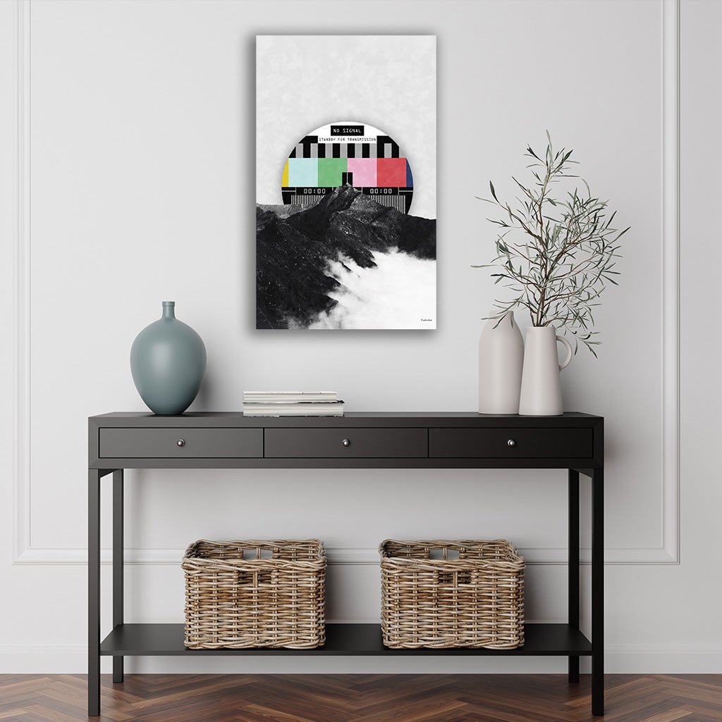 The picture shows an imposing mountain peak that sits like a majestic backdrop at the bottom of the picture. The mountain top is in black and white. But what makes the picture particularly fascinating is the background. A familiar TV trouble sign appears behind the mountaintop, creating a sort of "out of the grid" atmosphere. It seems as if the image breaks out of the usual grid and takes the viewer into another dimension.