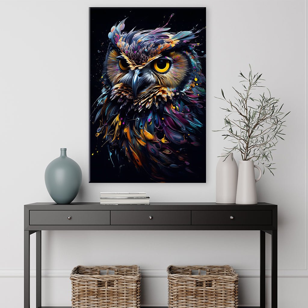 Lots of little colorful blobs of color and lines make up this great owl, which can be seen on a black background. The many small blobs of color create a unique work of art that wonderfully combines the beauty of the lady and the creativity of the artist.