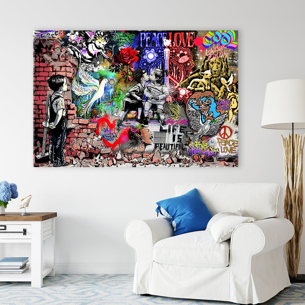 A collage of various motifs by the well-known StreetAt artist Banksy in a wonderfully executed picture that is about love and peace.