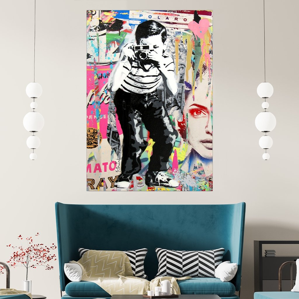 This famous motif by the street artist Banksy shows a boy with a camera using the stencil technique on a colorful graffiti background. The picture is a great addition to your room decoration in the living room, bedroom or hallway.