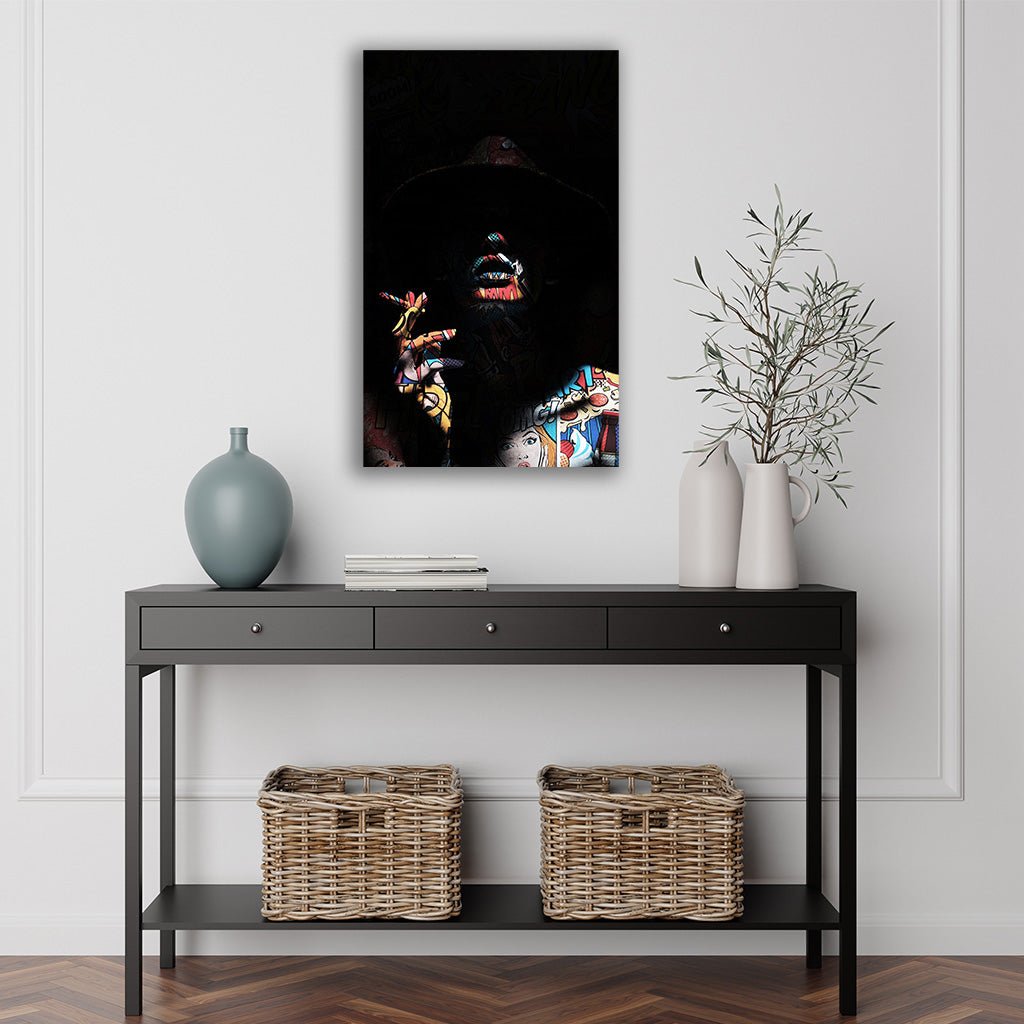 The motif shows a woman partially obscured by the dark shadow, meaning her face and body are only partially visible. She holds a cigarette in her hand. The woman's body is designed with PopArt motifs, which are designed in strong and vibrant colors. There are various symbols, patterns and motifs that create a lively and dynamic atmosphere. The PopArt elements create an interesting visual tension in connection with the dark shadow that surrounds the woman.