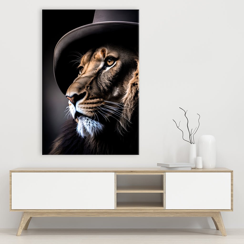 An inspirational image presents a lion dressed with a classic hat. This motif is a reminder that wildness and style can also go hand in hand. The lion symbolizes style and determination.