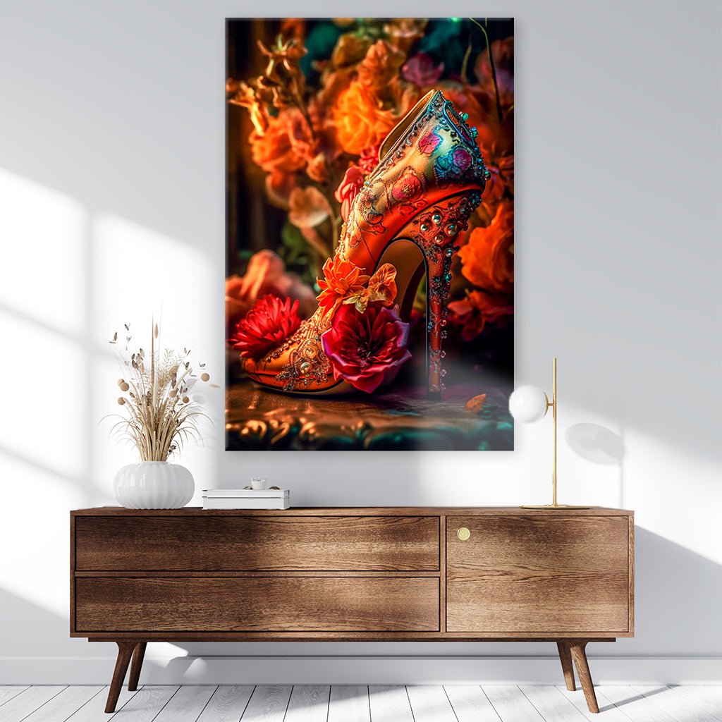 These stunning princess high heels are made for a real princess. The golden shoe is embroidered with roses, decorated with pearls and surrounded by flowers. A royal eye-catcher. If they don't end up in your shoe cabinet, then definitely on your wall in the hallway, living room, office or bedroom.