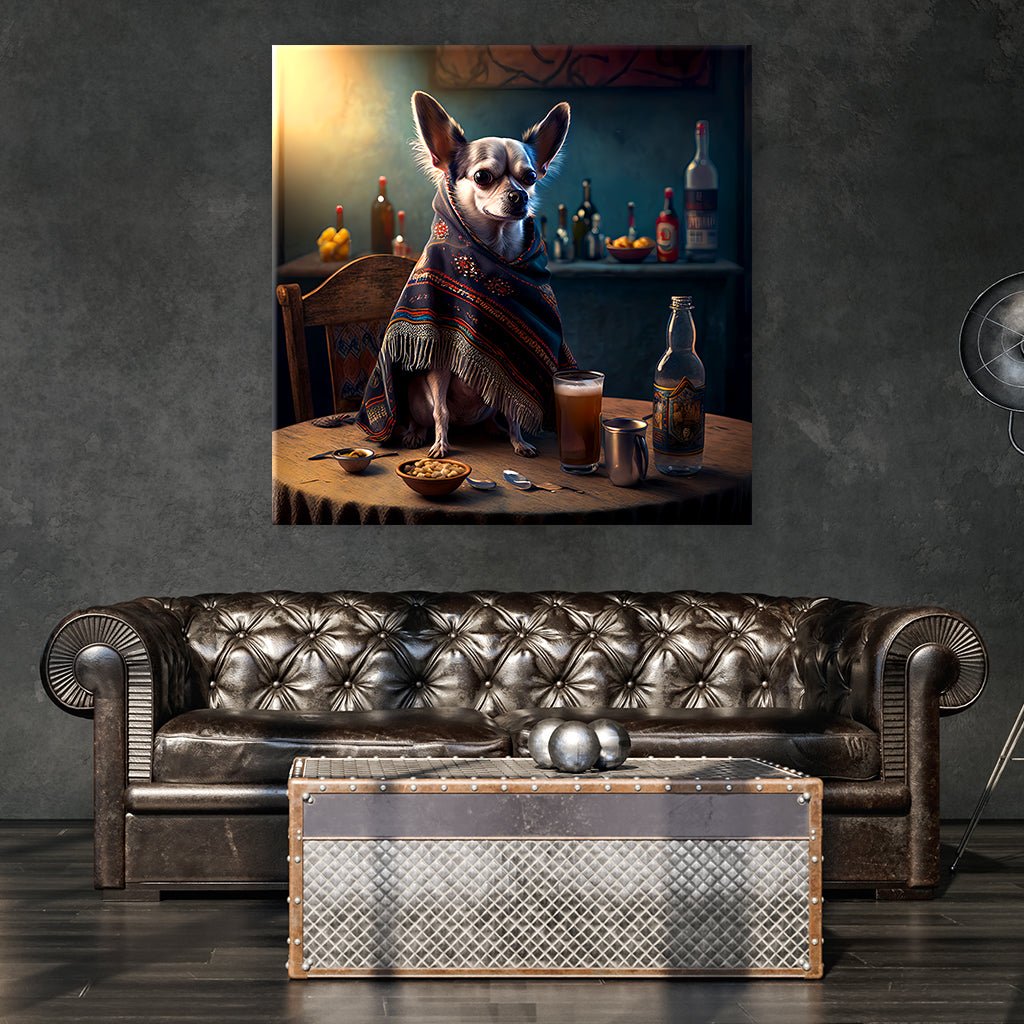 In an animal bar, a Chihuahua in a poncho sits on a table and enjoys a Mexican beer. The atmospheric lighting design underlines the atmosphere of this unusual scene. An unusual motif that brings the unusual bar visit of an animal guest into your room with the typical charm of a bar.