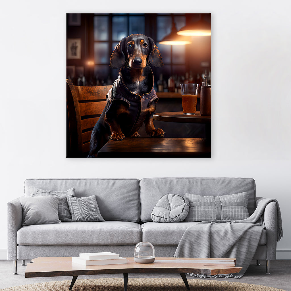 In an animal bar, a dachshund in his classic leather jacket sits at the table and enjoys a beer. The atmospheric lighting design underlines the atmosphere of this unusual scene. An unusual motif that brings the unusual bar visit of an animal guest into your room with the typical charm of a bar.