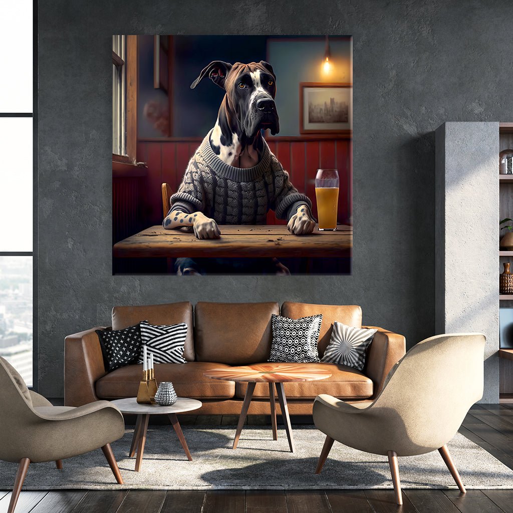 In an animal bar, a Great Dane in a grey wool sweater sits at the table and enjoys a beer. The atmospheric lighting design underlines the atmosphere of this unusual scene. An unusual motif that brings the unusual bar visit of an animal guest into your room with the typical charm of a bar.