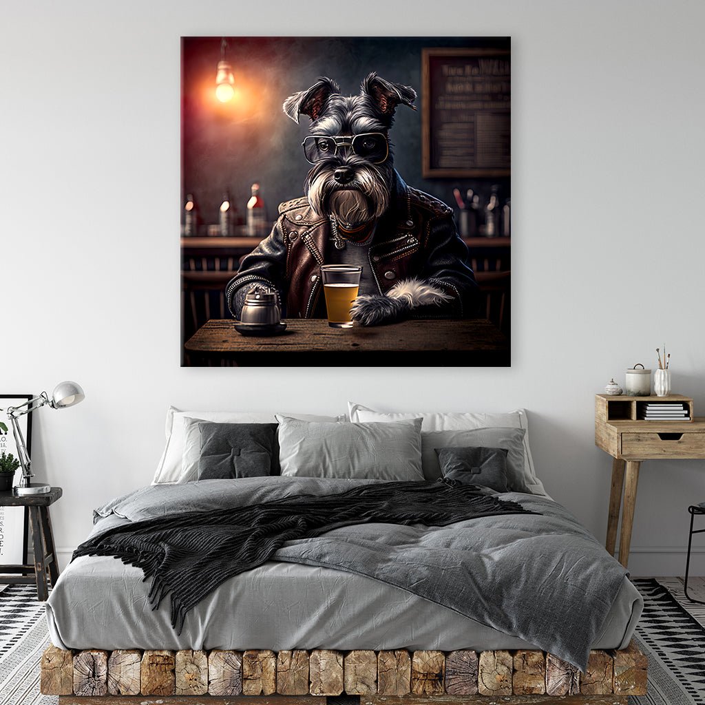 In an animal bar, a schnauzer wearing a leather jacket and large glasses sits at the table and enjoys a beer. The atmospheric lighting design underlines the atmosphere of this unusual scene. An unusual motif that brings the unusual bar visit of an animal guest into your room with the typical charm of a bar.