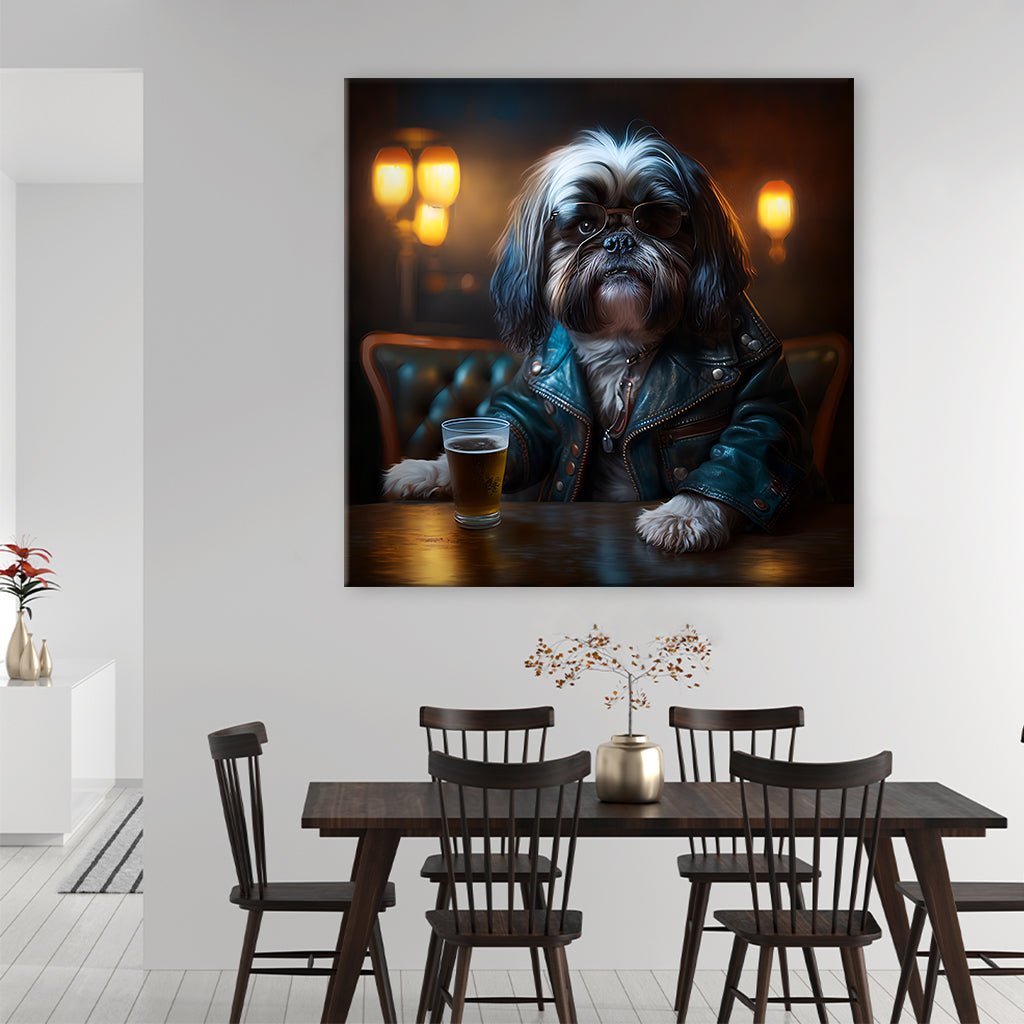 In an animal bar, a Shih Tzu wearing a black leather jacket sits at a table and enjoys a beer. The atmospheric lighting design underlines the atmosphere of this unusual scene. An unusual motif that brings the unusual bar visit of an animal guest into your room with the typical charm of a bar.