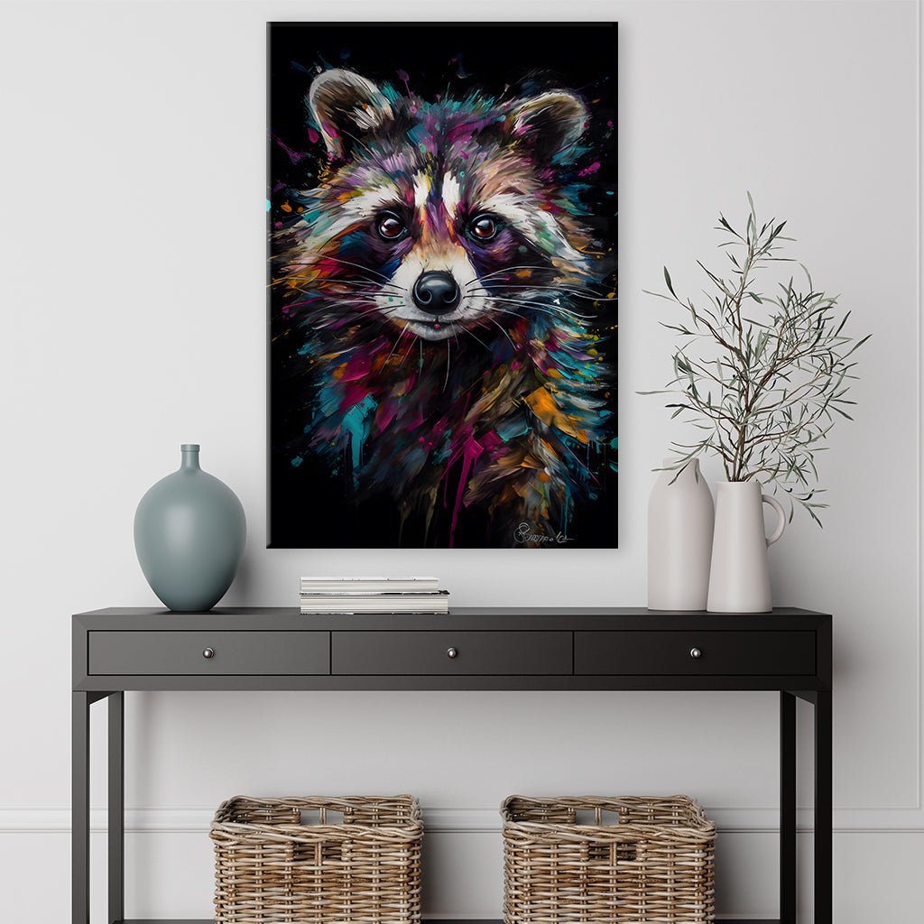 Lots of little colorful blobs of color and strokes create this cute raccoon, which can be seen on a black background. The many small blobs of color create a unique work of art that wonderfully combines the beauty of the lady and the creativity of the artist.