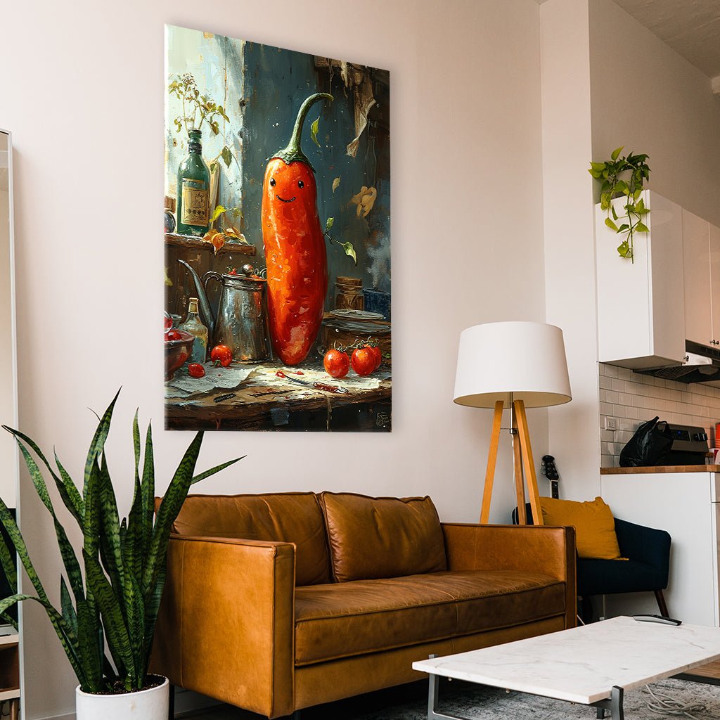 The scene features a cute depiction of a red chili with a smiling face standing on a kitchen countertop. Surrounding it are tomatoes, dishes and a watering can, making the scene cozy and homely.