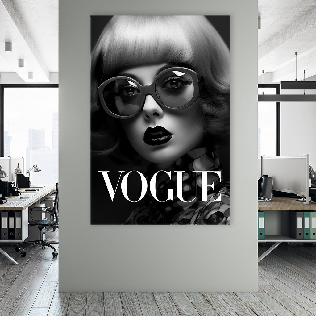 This impressive retro-style motif features a lady with large retro sunglasses and black lips. The large lettering “VOGUE” is emblazoned in the middle of the picture.