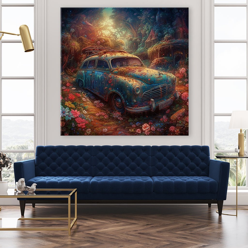 A blue vintage car stands in the middle of nature, surrounded by lush plants and colorful flowers. The surroundings have lovingly embraced the car while it blends harmoniously into the natural splendor. The subtle, nostalgic color design gives the picture a timeless atmosphere that is reminiscent of bygone times.
