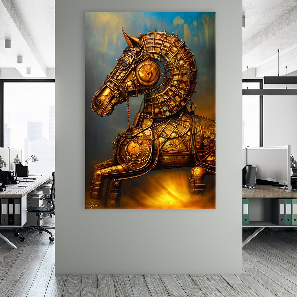 This extraordinary motif takes you into the surreal world of steampunk style, where a majestic horse takes center stage. The horse is made entirely of golden metal and embodies a futuristic interpretation of the classic aesthetic. The futuristic elements create a mix of vintage and high-tech designs. It symbolizes the limitlessness of imagination and opens up a new dimension of wonder and inspiration.