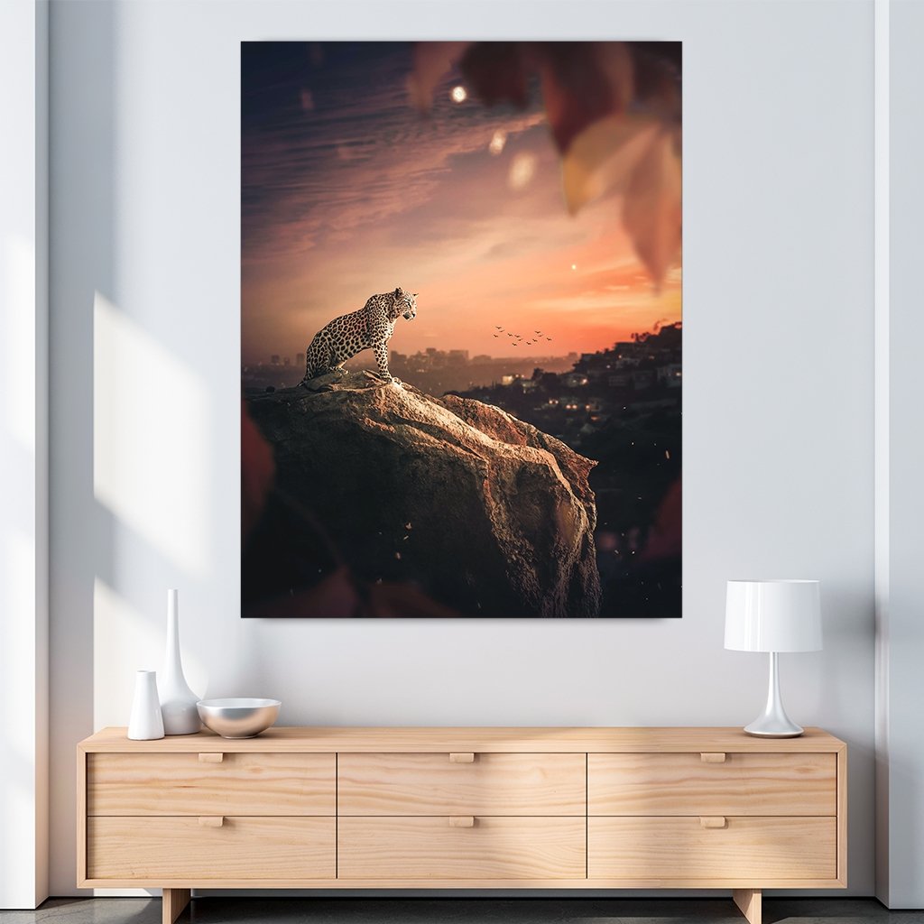 A leopard rests on an imposing rocky outcrop, looking into the distance and the city on the mountainside in the background. The setting sun bathes the scene in warm, golden light. The majestic animal and the city form a harmonious connection between wilderness and civilization.