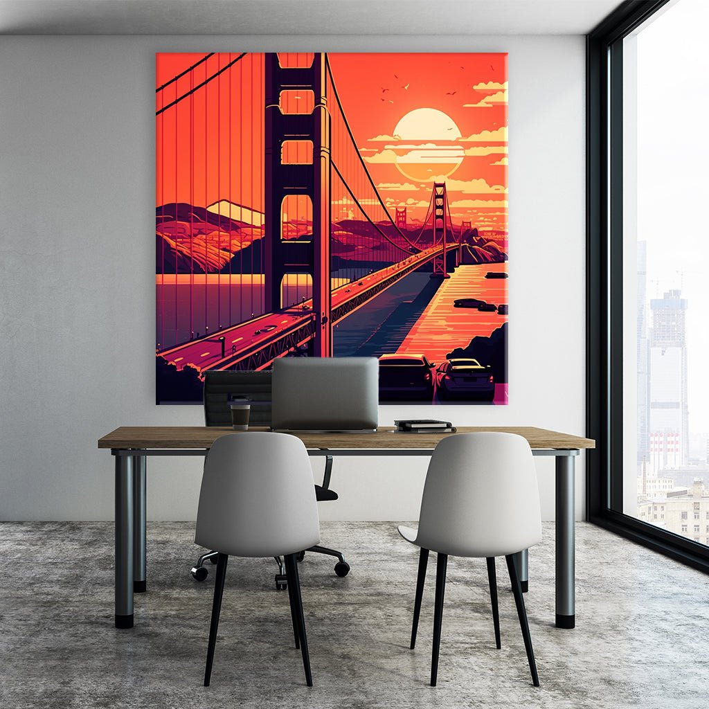 The image shows the Golden Gate Bridge in San Francisco at sunset in vector art, with the sky in the background glowing in vibrant orange and red tones. The bridge itself is depicted in various shades of black, red and orange and is the foreground of the image.