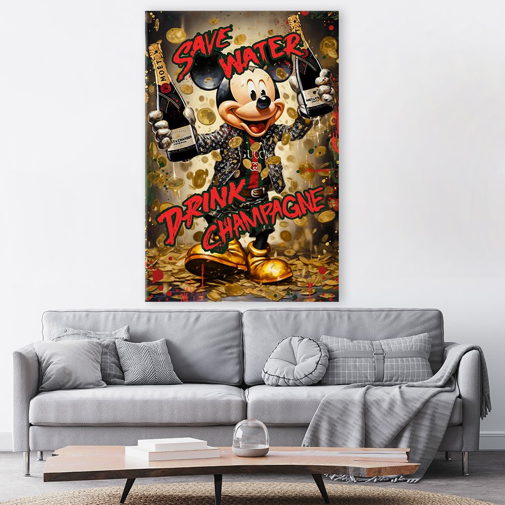 The image features a depiction of Mickey Mouse in luxurious clothing. Mickey is wearing a black Louis Vuitton jacket and gold shoes. He is holding two champagne bottles and standing in front of a background of raining coins. The words "SAVE WATER, DRINK CHAMPAGNE" are written in large, red letters across the image, giving a satirical and luxurious atmosphere.