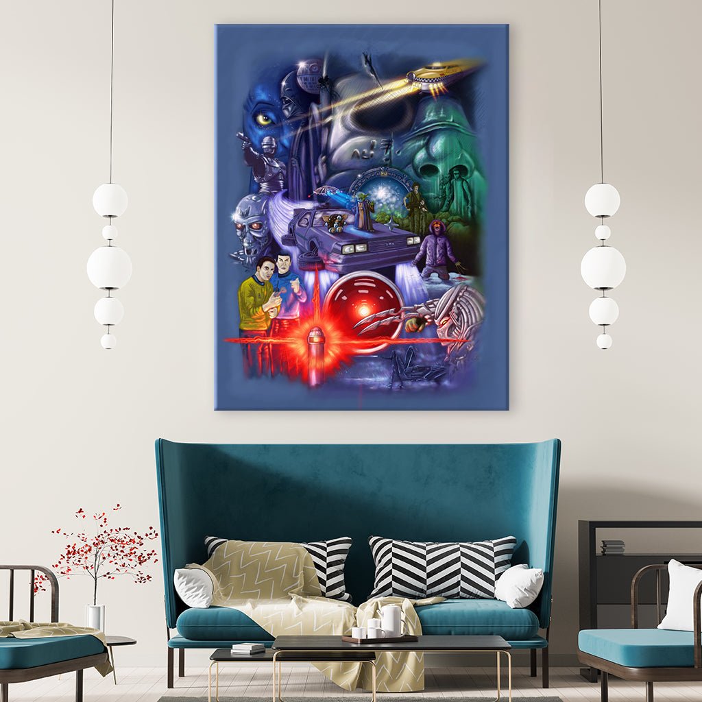 Well-known figures from the films Avatar, Star Wars, ET and Terminator can be seen on this special collage and are therefore a great eye-catcher for your picture wall in the living room, bedroom, hallway or office.