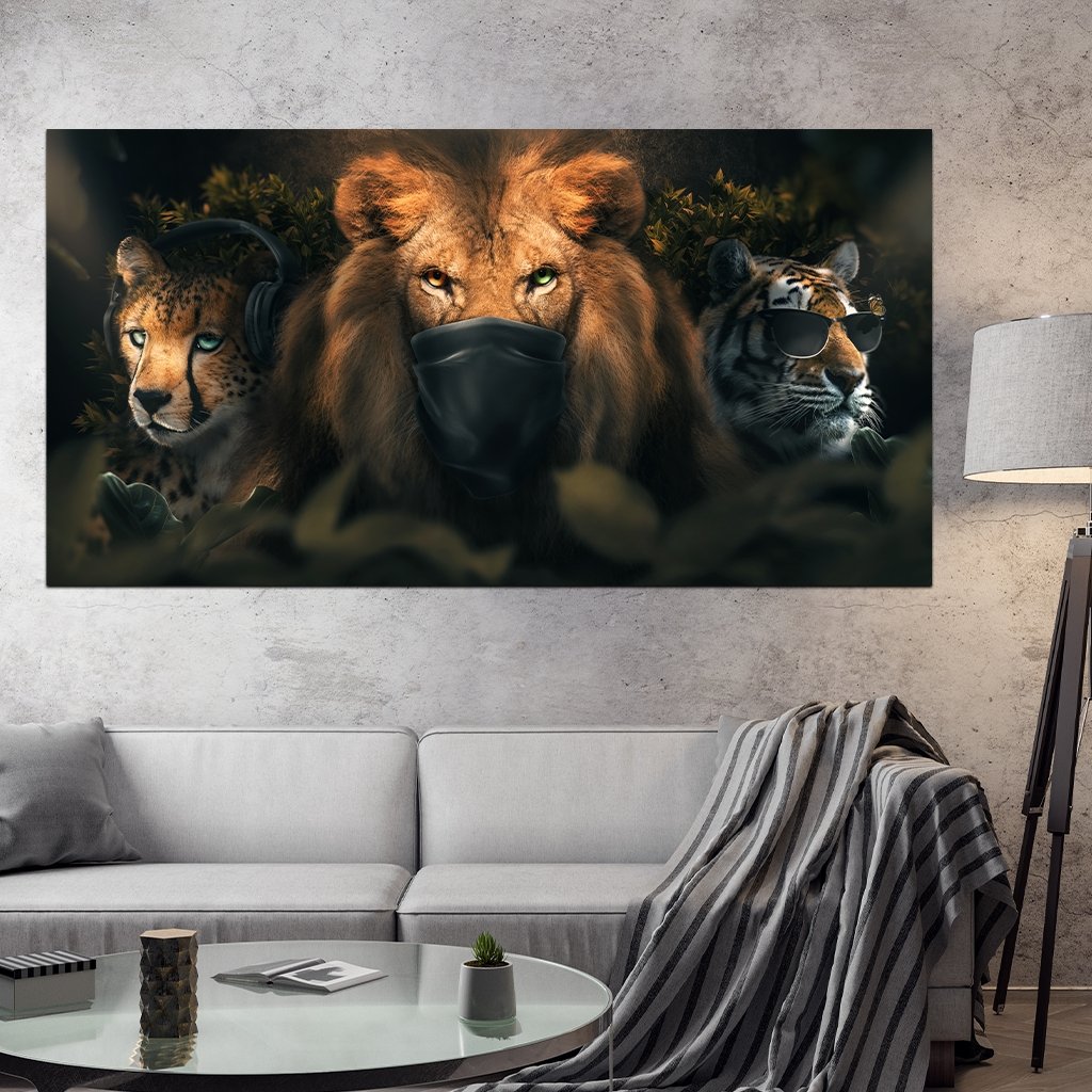 The Three Wise Monkeys rebooted with three of the most popular big cats. A lion with a black mouth mask for “says nothing”, a tiger with sunglasses for “sees nothing” and a cheetah with headphones for “hears nothing”. Ideal for your living room, bedroom or hallway and a slightly different eye-catcher.