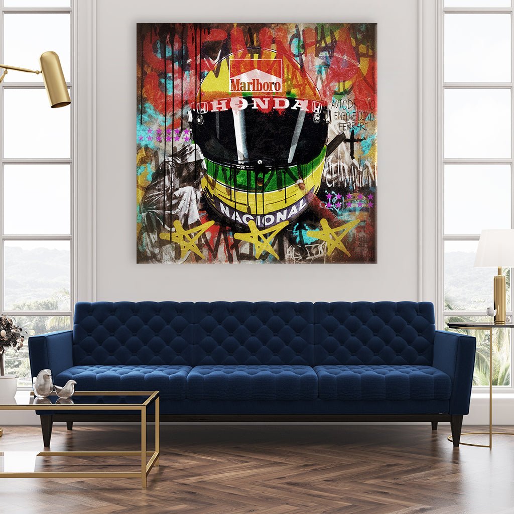 A racing helmet bearing the colors of Brazil, overlaid with logos like "Marlboro" and "Honda." The background is a vibrant chaos of red, blue, and yellow graffiti elements, including paint splatters and lettering. The work captures the energy of motorsports and is a tribute to a champion, presumably Ayrton Senna.
