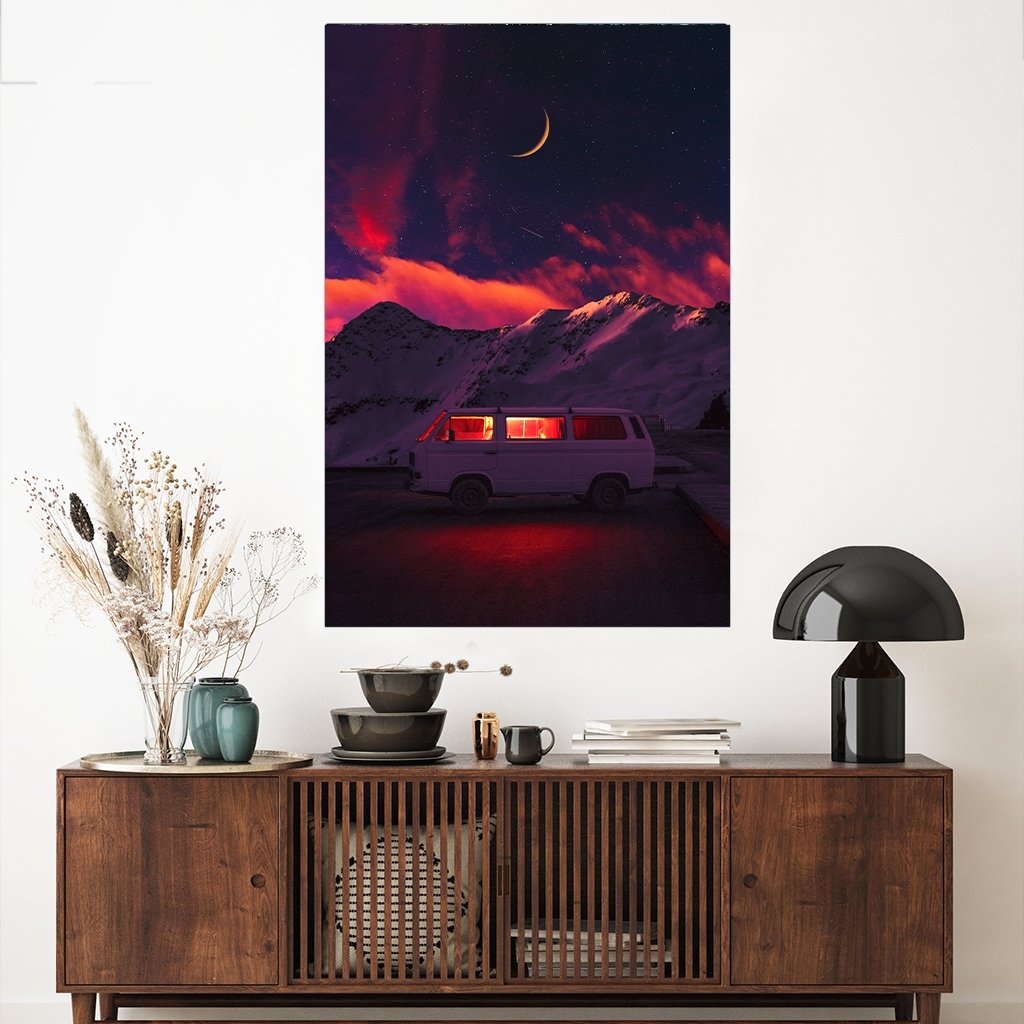 The motif shows an old, charming VW Bully that radiates nostalgia and a sense of adventure. The Bully stands in front of a breathtaking backdrop of snow-capped mountains that rise majestically into the background. The sky presents itself in an intense evening red, while the crescent moon is already shining in the sky.