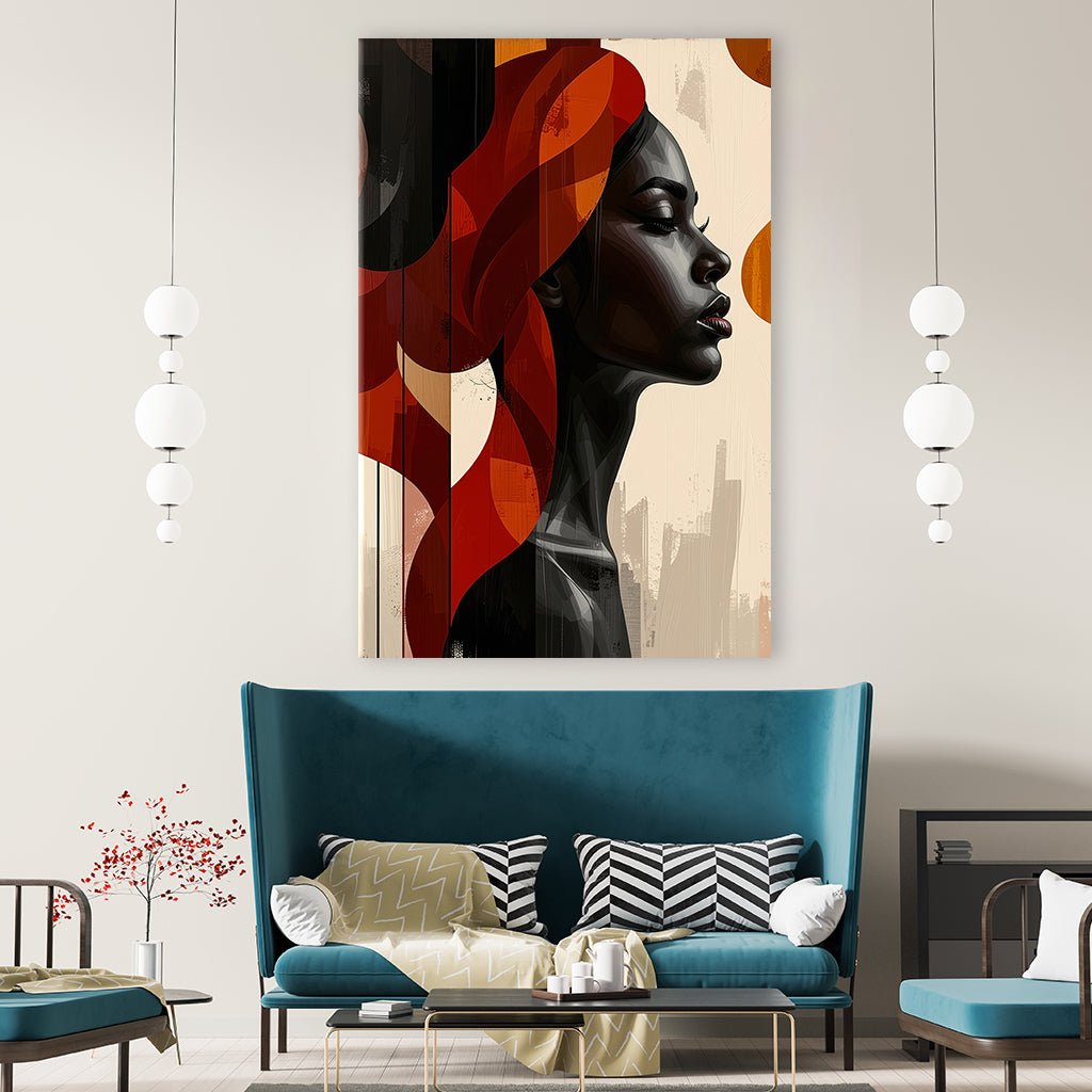 This expressive image depicts a woman's profile, rendered in a modern, almost geometric style. Her face is richly detailed, with prominent eyelashes and lips, while her hair and the background consist of abstract, overlapping shapes in warm red, orange, and brown tones. The combination of realistic and abstract elements creates an interesting tension and lends the image a contemporary aesthetic.