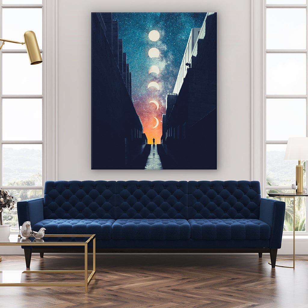 Walking through the night and being alone with yourself. The different phases of the moon in the starry sky that you can see between the alleys allow you to linger on the motif. The perfect eye-catcher for your living room, hallway or office.