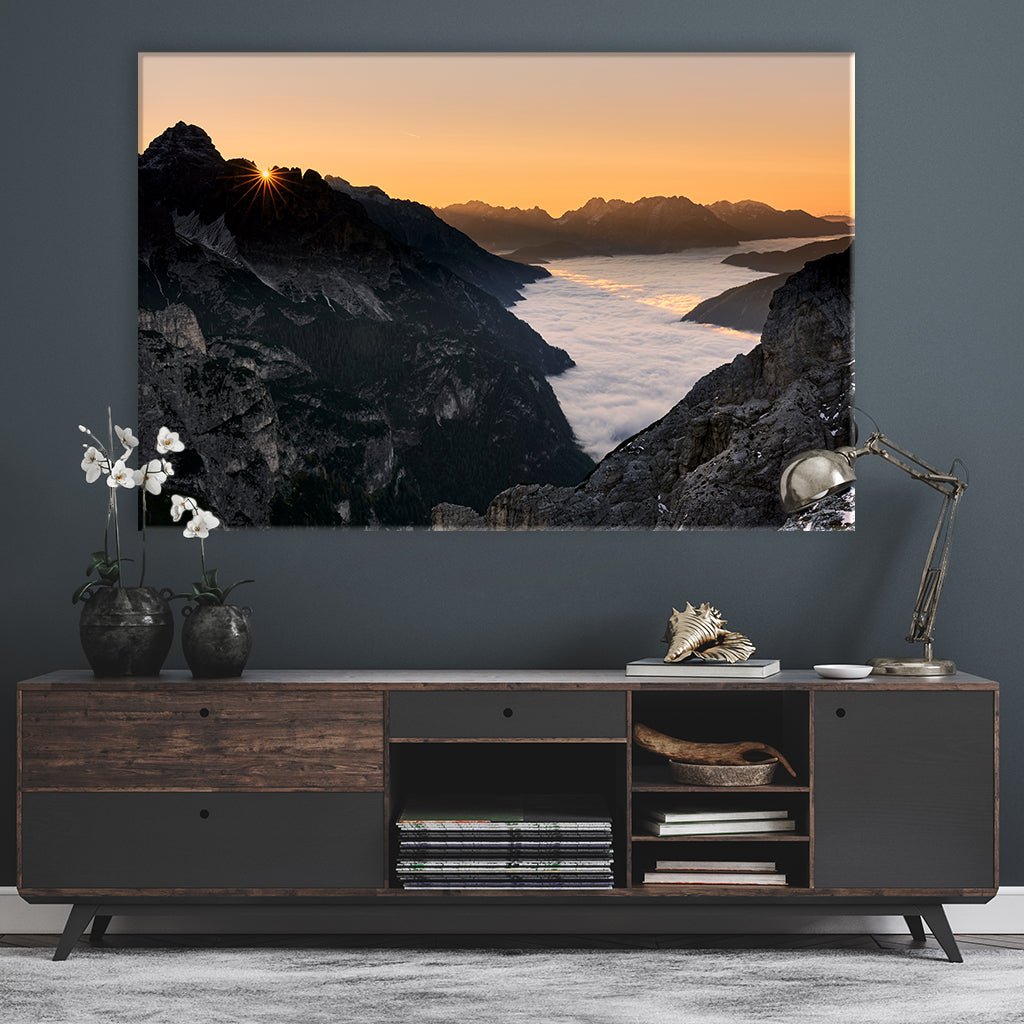 The Dolomites are a mountain group in the southern Limestone Alps and are part of the UNESCO World Heritage Site due to their beauty and uniqueness. Our picture shows part of the mountains high above the clouds and the sun conjures up its great play of colors in the sky.