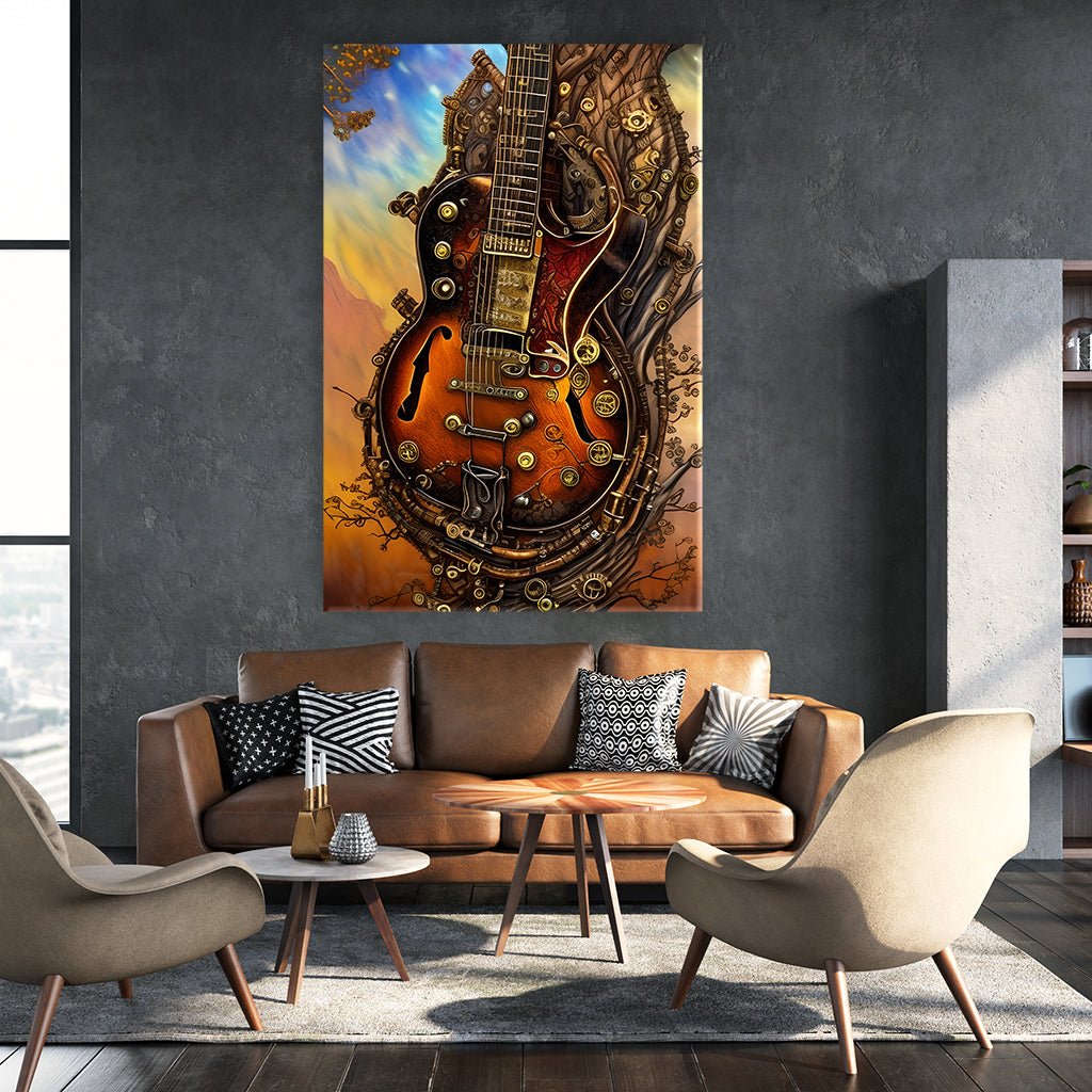 A fascinating steampunk aesthetic merges with a guitar in warm brown tones. This work of art combines music and imagination to create a unique visual experience. The steampunk elements give the guitar a mysterious and mechanical touch, while the abstract shapes leave room for interpretation. The combination of steampunk aesthetics, abstraction and warm brown tones creates a captivating connection between art and technology.