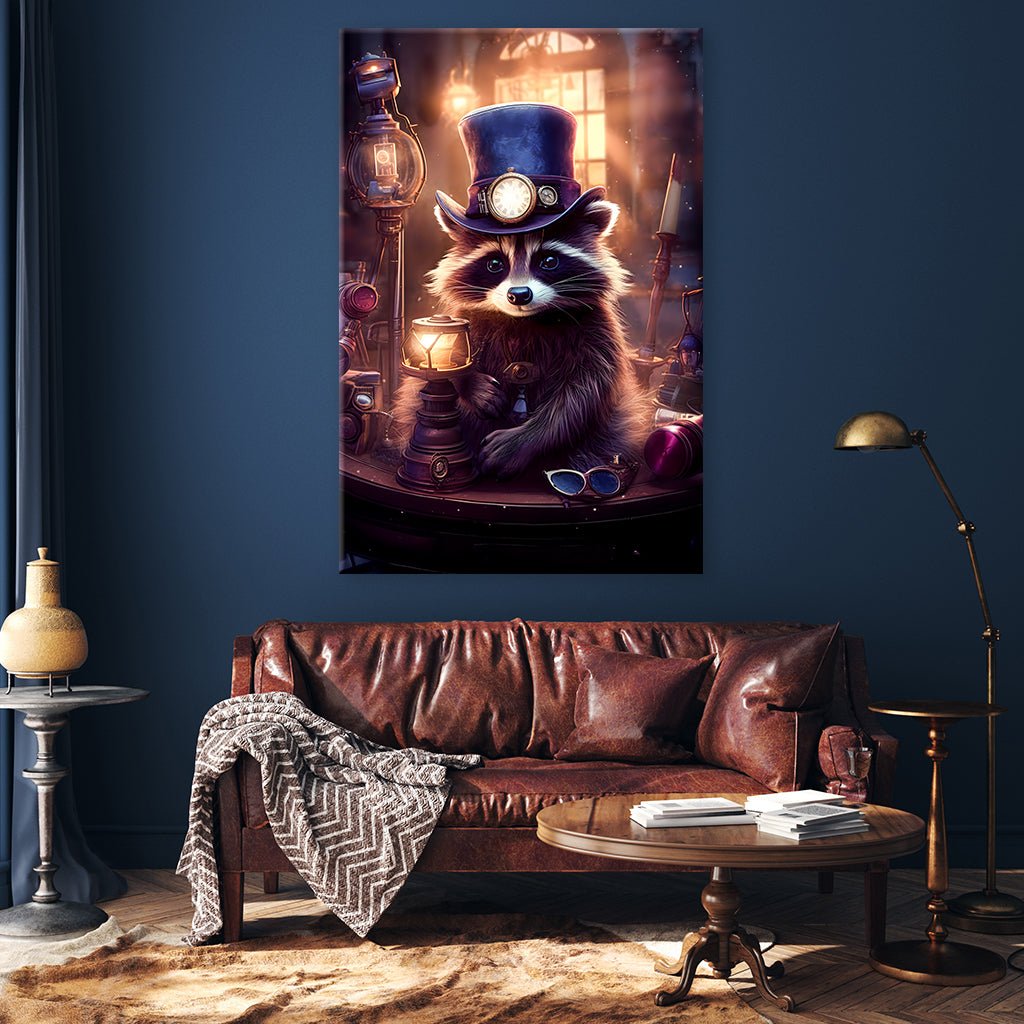 The picture shows a cute raccoon in a steampunk outfit with a large top hat. Our steampunk raccoon is perfect for those looking for a special image that will stand out. With typical steampunk elements and an industrial touch, this picture is a special eye-catcher.