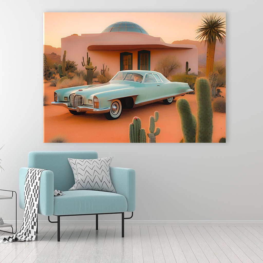 The image shows a sleek, mint green vintage car parked in front of a futuristic, dome-like house in the middle of a desert landscape. The house has a curved, modern architecture that is accentuated by the warm, orange surroundings and the spiky cacti. The scene is set in soft, warm tones that reflect the light of the setting sun.