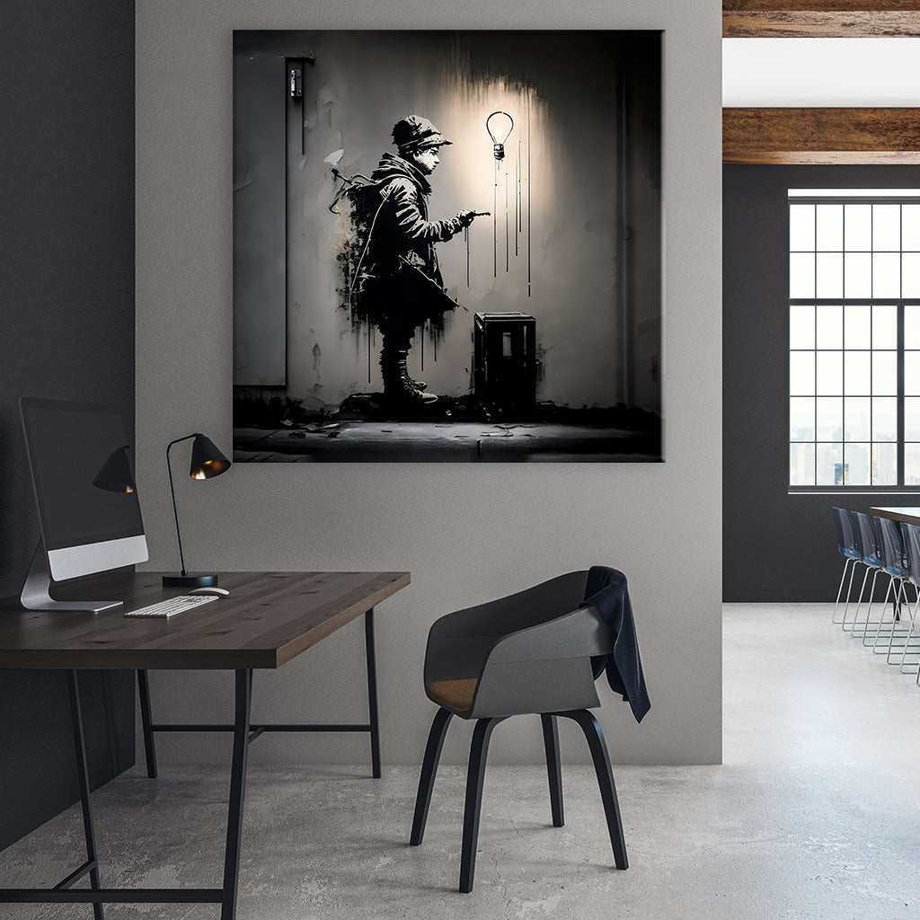 Discover a fascinating street art image in the style of Banksy! With its distinctive black and white tones and a powerful message, this work of art is a real eye-catcher. The detailed design and the skilful use of shades and textures create an impressive effect and captivate the viewer.
