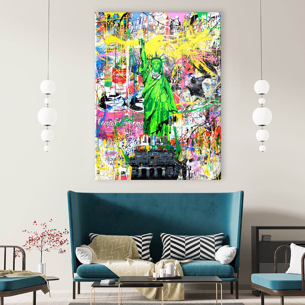 The graffiti image shows the Statue of Liberty in green as the central motif. The statue stands in front of a street art work of art in bright colors. Some of the artworks feature Banksy motifs, such as the famous flower thrower. The overall effect of the image is very lively and colorful and shows the diversity and creativity of the street art scene.