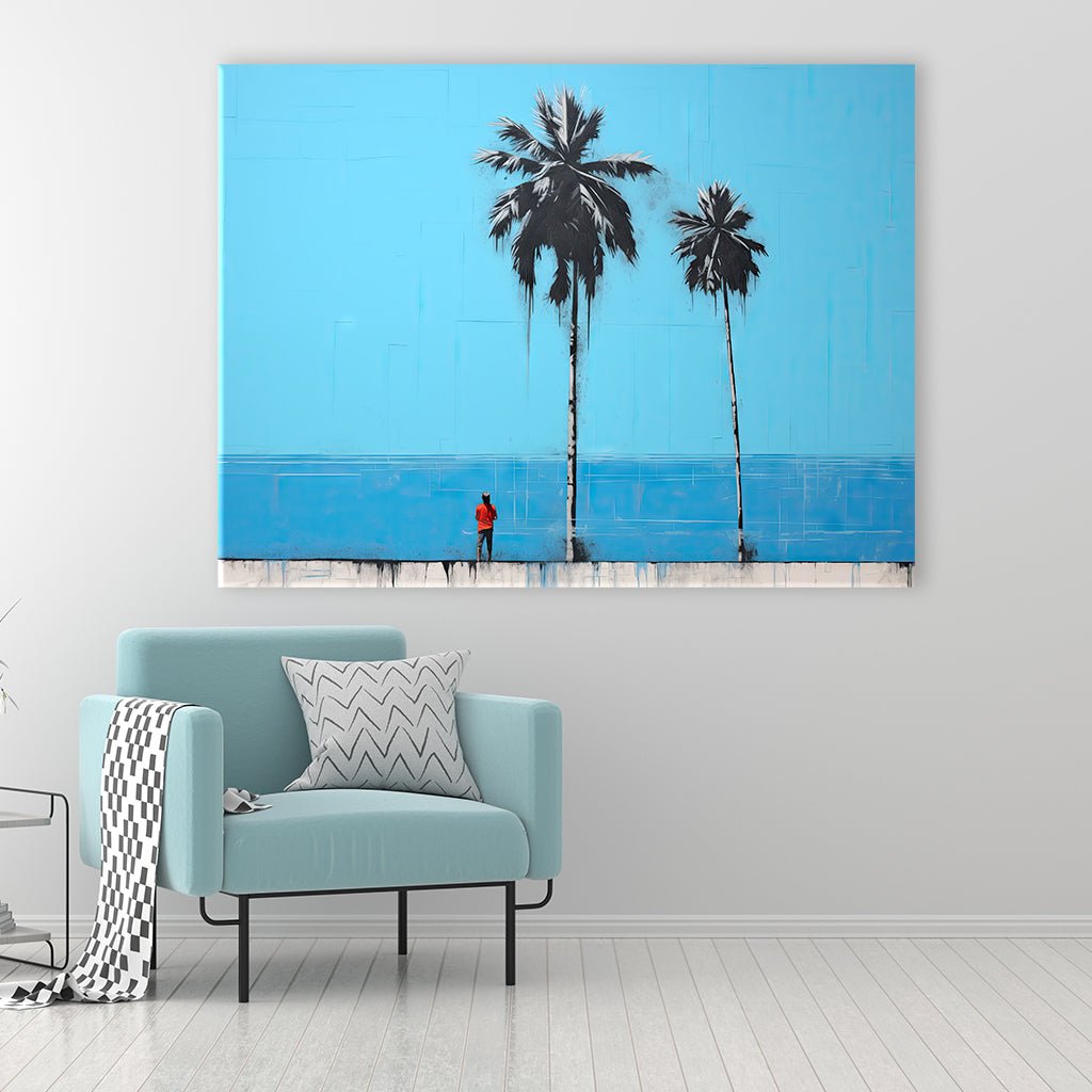 The street art motif presents an imposing scene: a massive blue wall serves as a canvas for two majestic palm trees that stand proudly against the sky. In the lower half of the picture, a small person in a bright red sweater draws the eye. Her figure is modest in size, but her focus is on the crowns of the palm trees that rise above her.