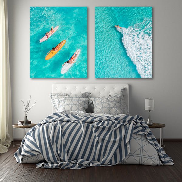 Surfing is a strenuous yet breathtakingly beautiful sport. Surf through meter-high waves or simply paddle across the sea in a relaxed manner on your surfboard. Just like the ladies in our motif with turquoise blue Merr among them.