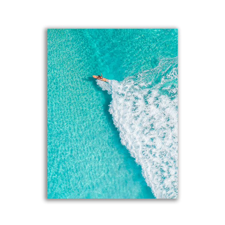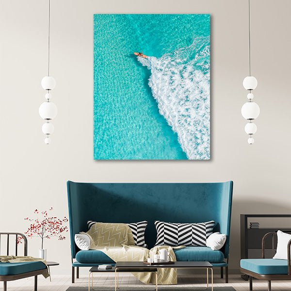 A surfer on his surfboard rides the waves of the turquoise sea. Viewed from above, this motif shows this fantastic sport and leisure activity from a completely different perspective. This motif is perfect for your modern living room, office or loft apartment.