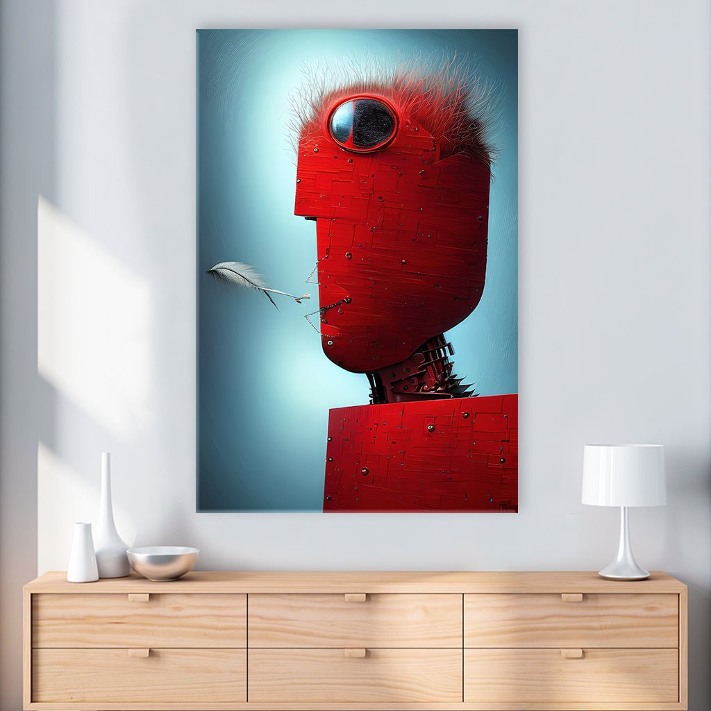 Consider this fascinating abstract motif that brings a red figure into focus. A world of fantasy unfolds on a blue background. Their distinctive feature is a single eye and it appears as if it is smiling. The abstract motif opens up space for individual interpretations and allows the viewer to immerse themselves in a world of fantasy.