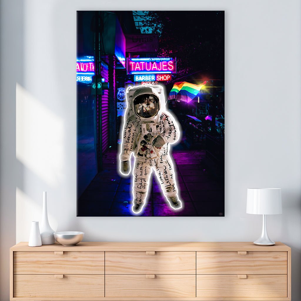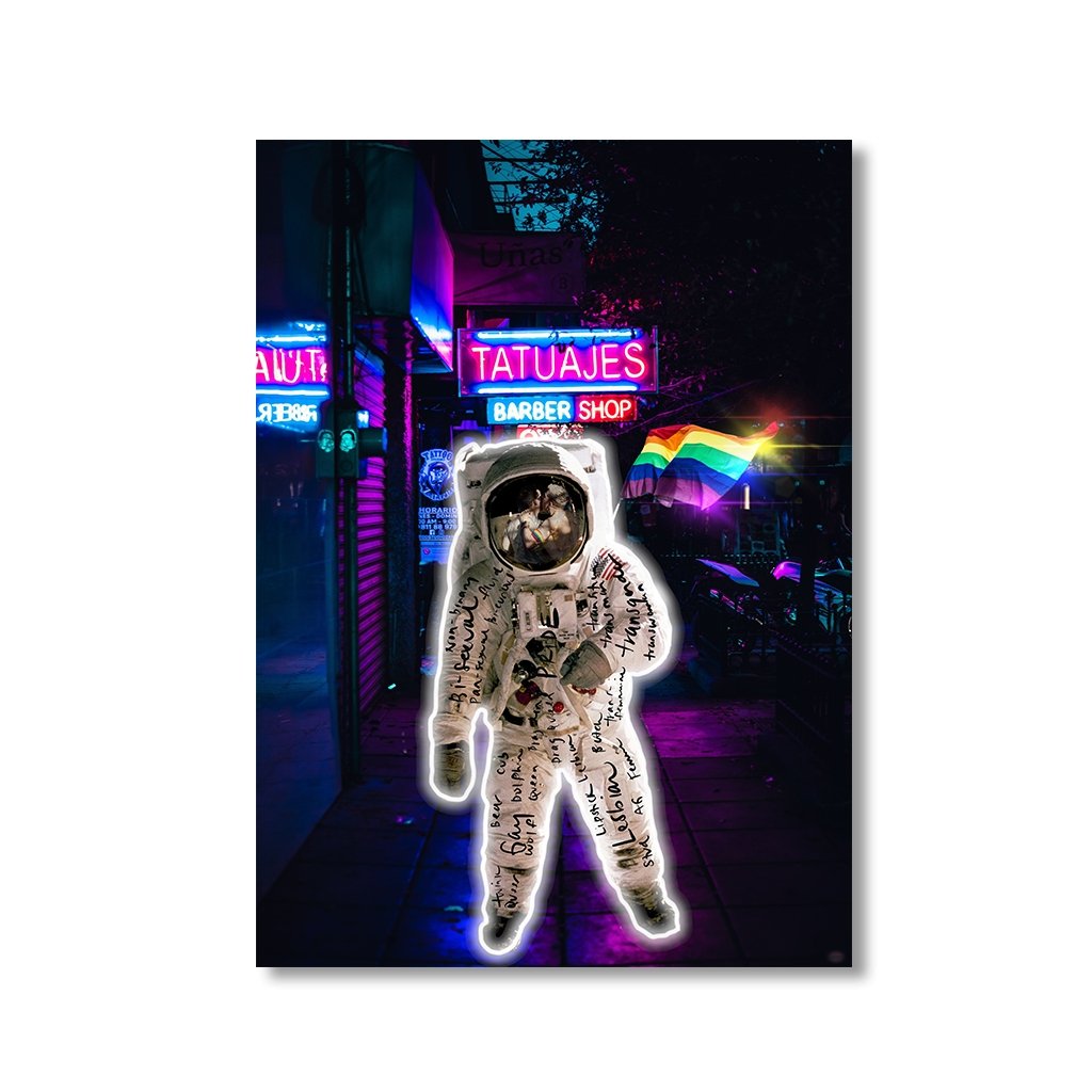 An astronaut coming out of a tattoo studio. His entire suit is tattooed with words like "lesbian", "gay" and many more. In the background is the flag of the LGBTQI community, which stands as a symbol of diversity, pride and self-assertion. Highlighted in neon style, this picture is an extraordinary eye-catcher for your bedroom, living room, office or hallway.