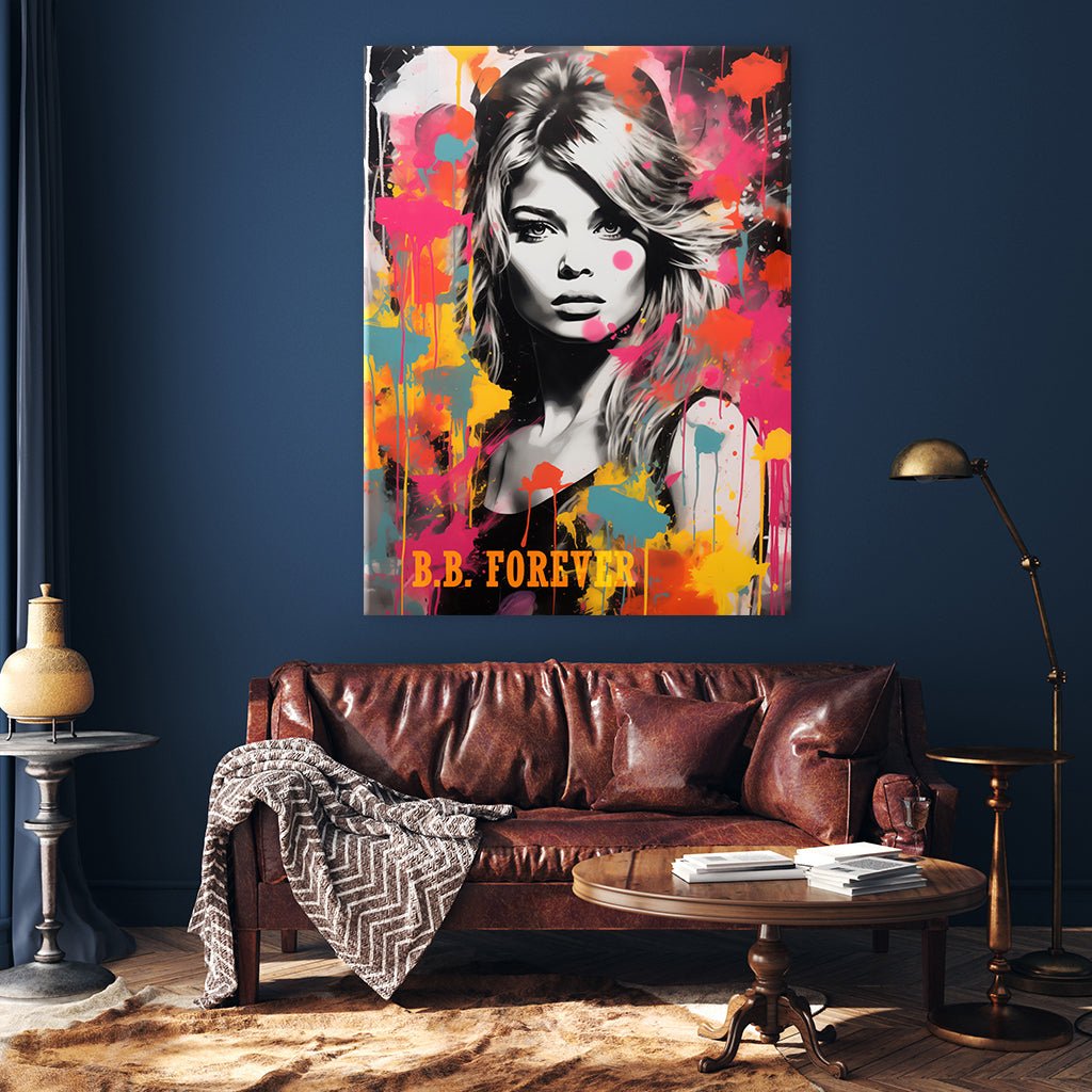 Portrait of a woman resembling Brigitte Bardot, with a black and white face and a high-contrast background with splashes of pink, turquoise, and orange. At the bottom of the image, the words "BB FOREVER" are written in red letters.