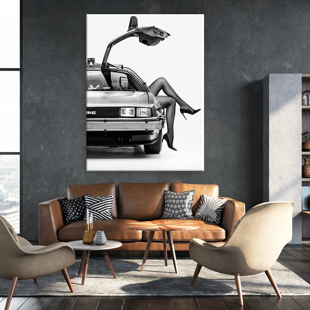 The future is... female. A very nice thought in view of this erotic picture with the DeLorean from which attractive women's legs in high heels protrude. An extraordinary eye-catcher for your walls in the living room, hallway or bedroom.