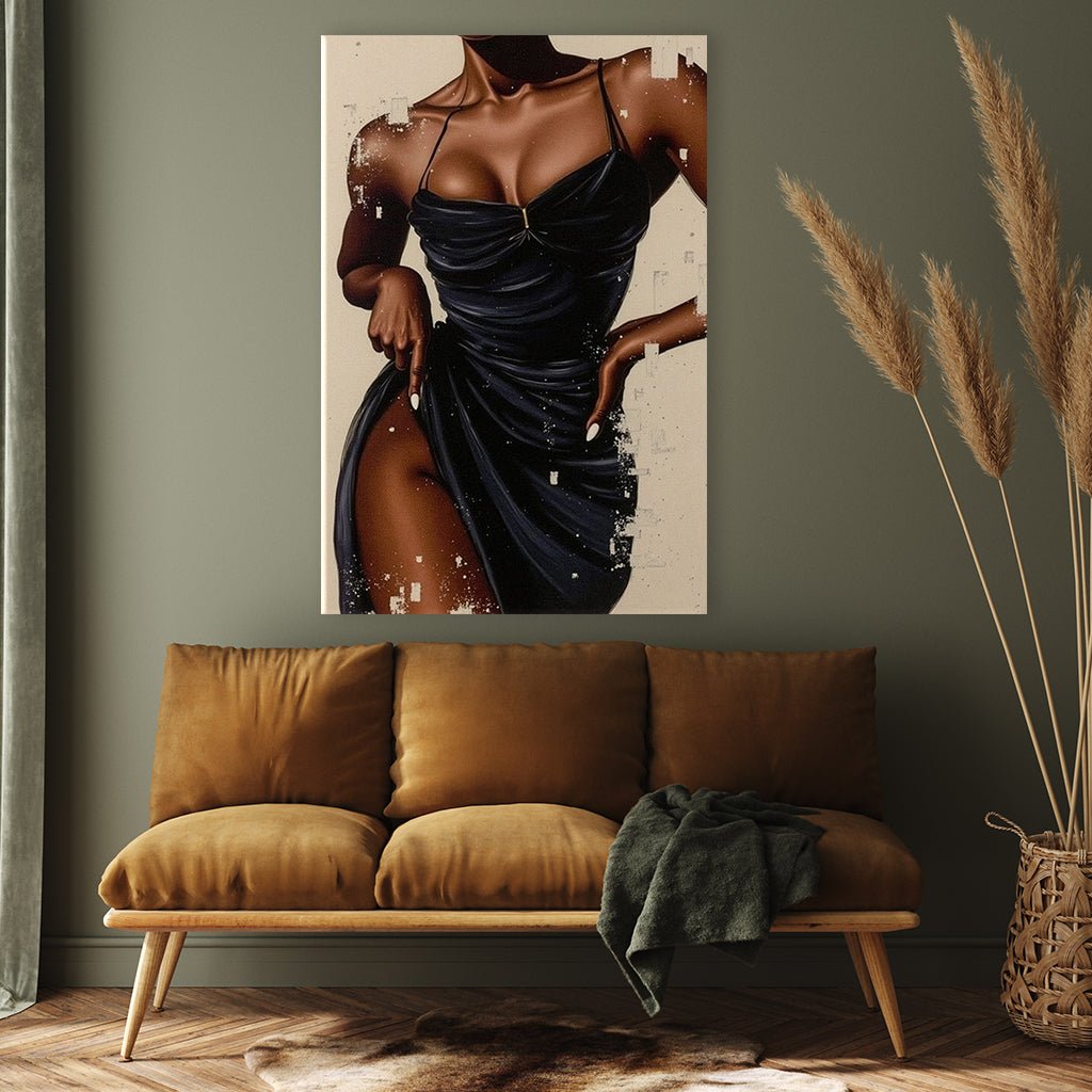 The image depicts a seductive woman in a classic little black dress with a plunging neckline, pulling one side of the dress up to her hips. The scene appears sensual and mysterious, with a strong contrast between the warm skin, the black dress, and the light background. The pose underlines the sensual aesthetic of the motif.