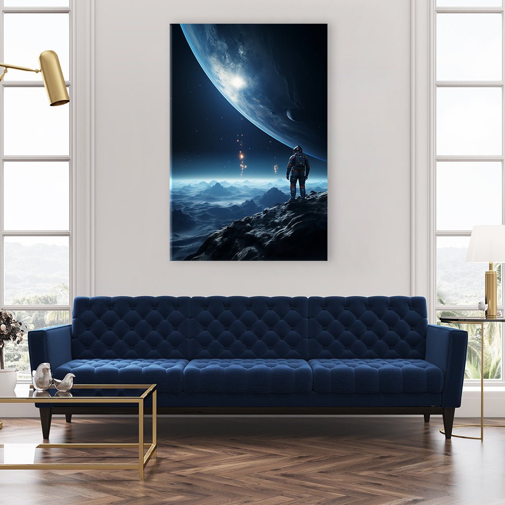 An astronaut stands on the edge of the moon and looks into the endless expanse of space. Behind him lies the rough surface of the moon, in front of him the infinite cosmos stretches out. The Earth floats majestically in the background, a blue jewel against the darkness of space. A moment of silence while contemplating the beauty of space, bringing many people's dreams to life.