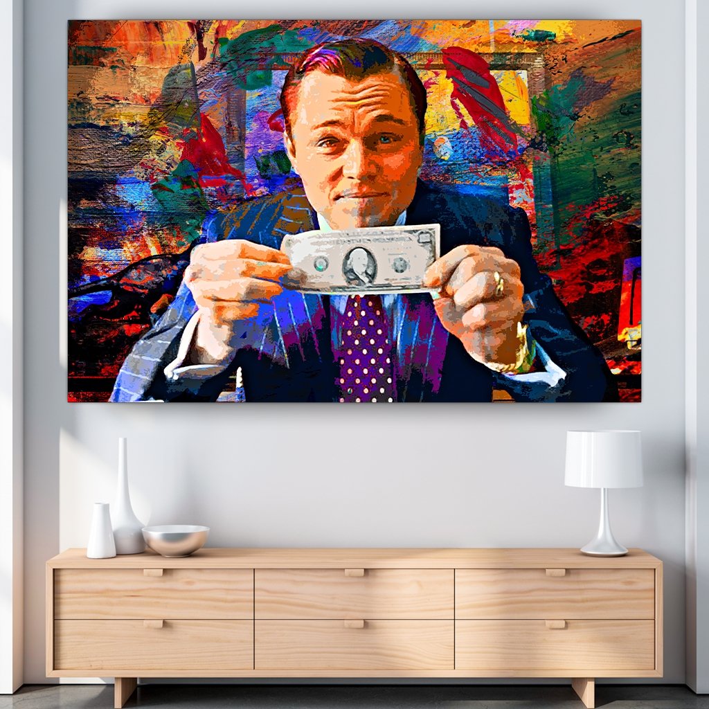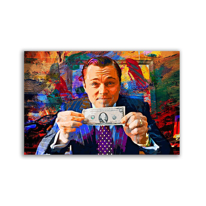 Leonardo DiCaprio is depicted as Jordan Belfort from the film of the same name "The Wolf of Wall Street" on an abstract background. He holds a dollar bill in his hand. Perfect for stimulating your motivation every day and offering creative inspiration with its many colors.